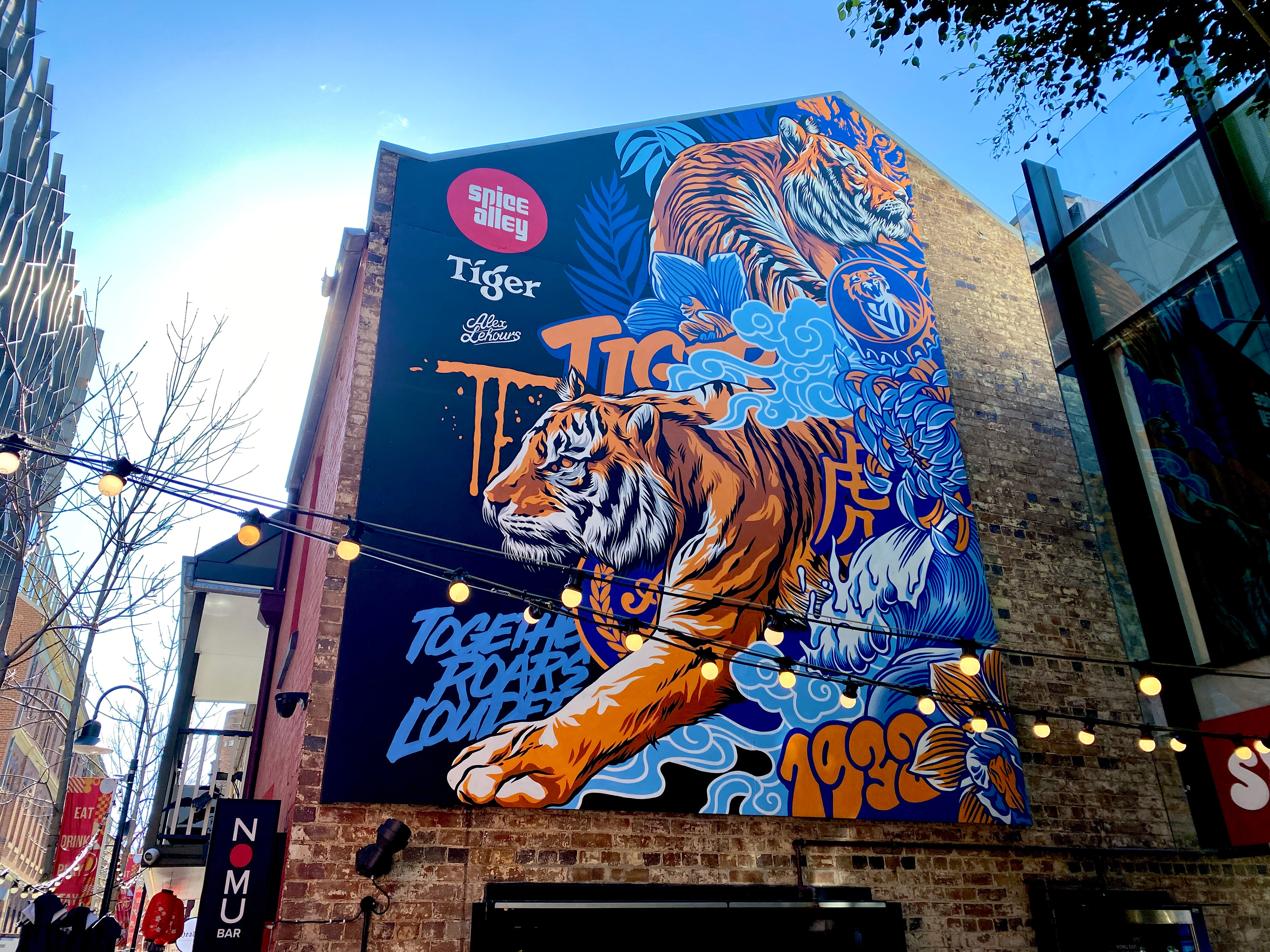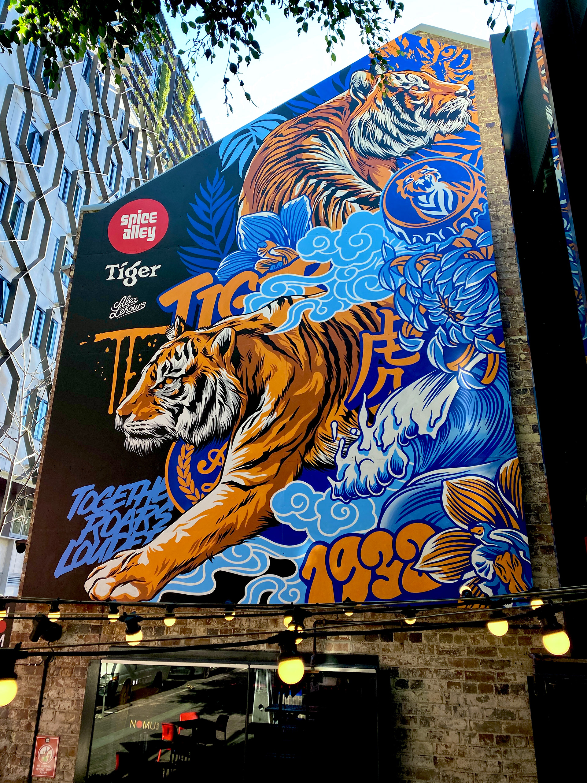 I was given artistic freedom in conceptualising and painting an artwork that captured the essence of the Tiger Beer brand as well as including aspects of Sydney and Spice Alley. I wanted this mural to be an art piece rather than an advertisement and I think I was able to do so in an effective way.